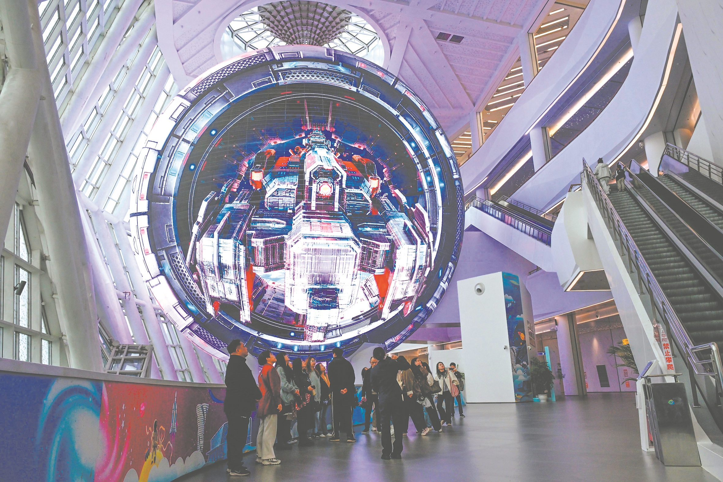 4月22日,游客观看《星舰裂空》科普视频。本报记者 徐旻昊 摄